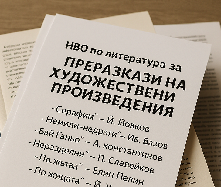 Този документ съдържа преразкази на всички художествени произведения, включени в изпитната програма за Национално външно оценяване (НВО) по български език и литература за 7. клас. Всеки текст е представен на достъпен език, с фокус върху основната тема, героите и посланията.